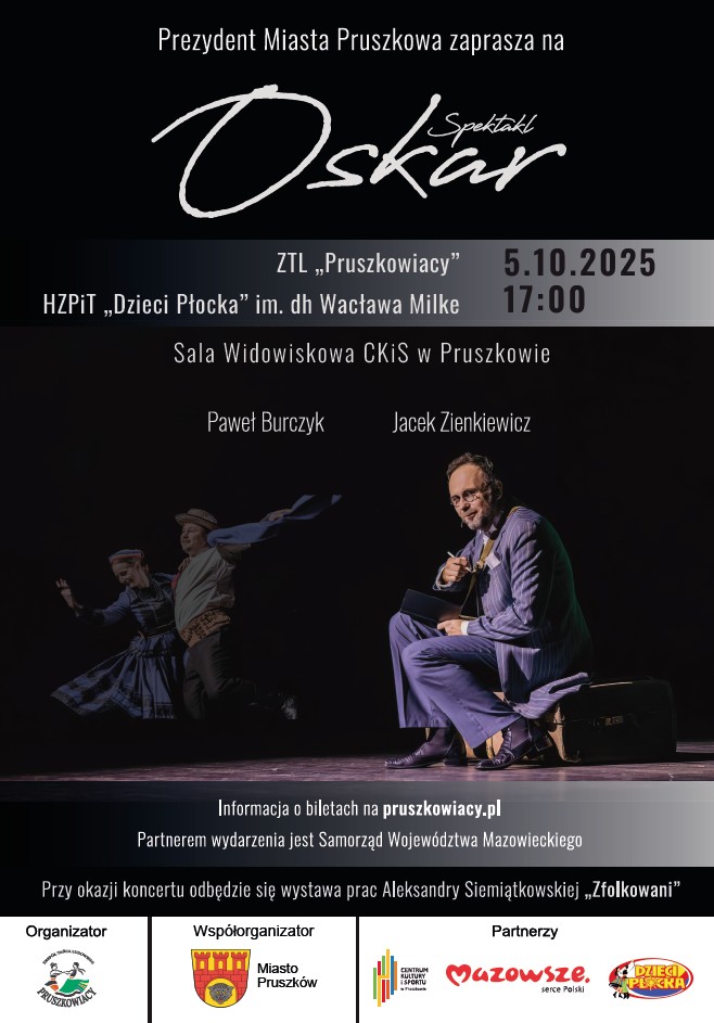 Zespół Tańca Ludowego „Pruszkowiacy” z okazji swojego Jubiluszu 45 lecia stworzył spektakl „Oskar”. To wyjątkowa podróż przez folklor polskich regionów, w której przewodnikiem jest postać wybitnego polskiego etnografa Oskara Kolberga. Spektakl spotkał się z gorącym przyjęciem publiczności. W maju br. został pierwszy raz wystawiony we współpracy z innym zespołem – ZPiT „Sokołowianie” – w Sokołowie Podlaskim. Sukces tej współpracy sprawił, że Zespół „Pruszkowiacy” chce kontynuować tę formułę i do wspólnego występu zaprosił tym razem Harcerski Zespół Pieśni i Tańca „Dzieci Płocka” z Płocka.