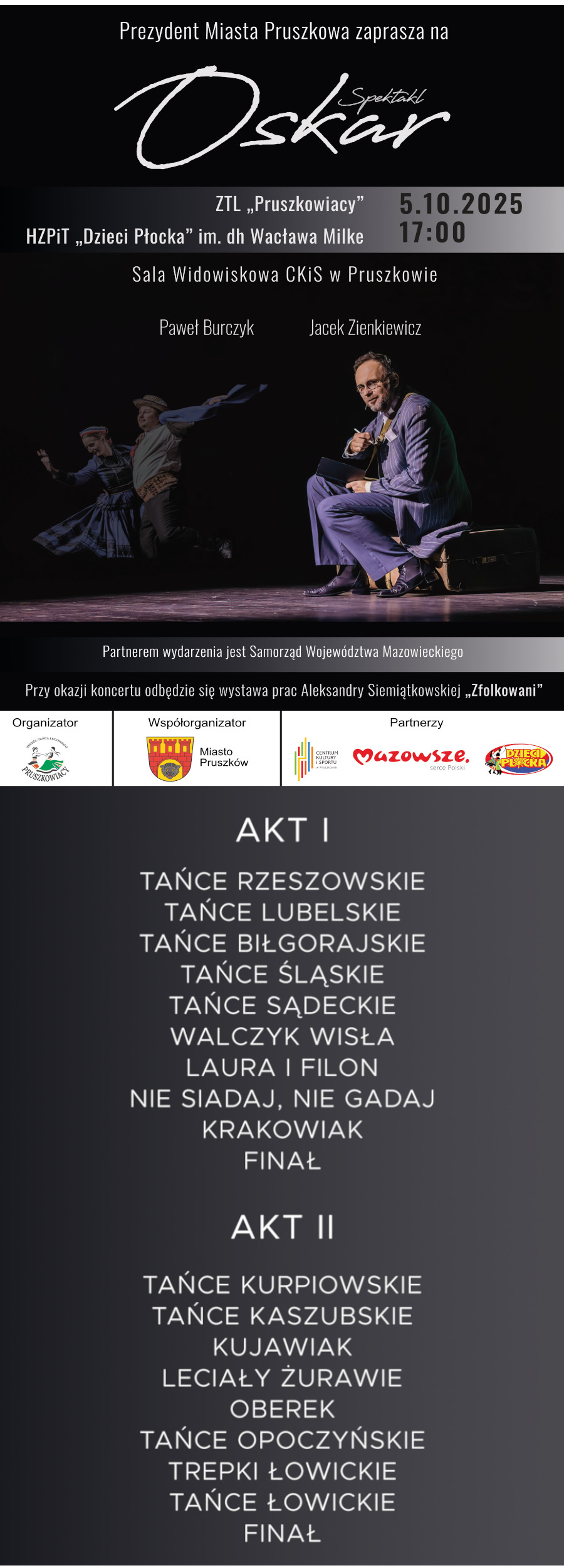 Zespół Tańca Ludowego „Pruszkowiacy” z okazji swojego Jubiluszu 45 lecia stworzył spektakl „Oskar”. To wyjątkowa podróż przez folklor polskich regionów, w której przewodnikiem jest postać wybitnego polskiego etnografa Oskara Kolberga. Spektakl spotkał się z gorącym przyjęciem publiczności. W maju br. został pierwszy raz wystawiony we współpracy z innym zespołem – ZPiT „Sokołowianie” – w Sokołowie Podlaskim. Sukces tej współpracy sprawił, że Zespół „Pruszkowiacy” chce kontynuować tę formułę i do wspólnego występu zaprosił tym razem Harcerski Zespół Pieśni i Tańca „Dzieci Płocka” z Płocka.